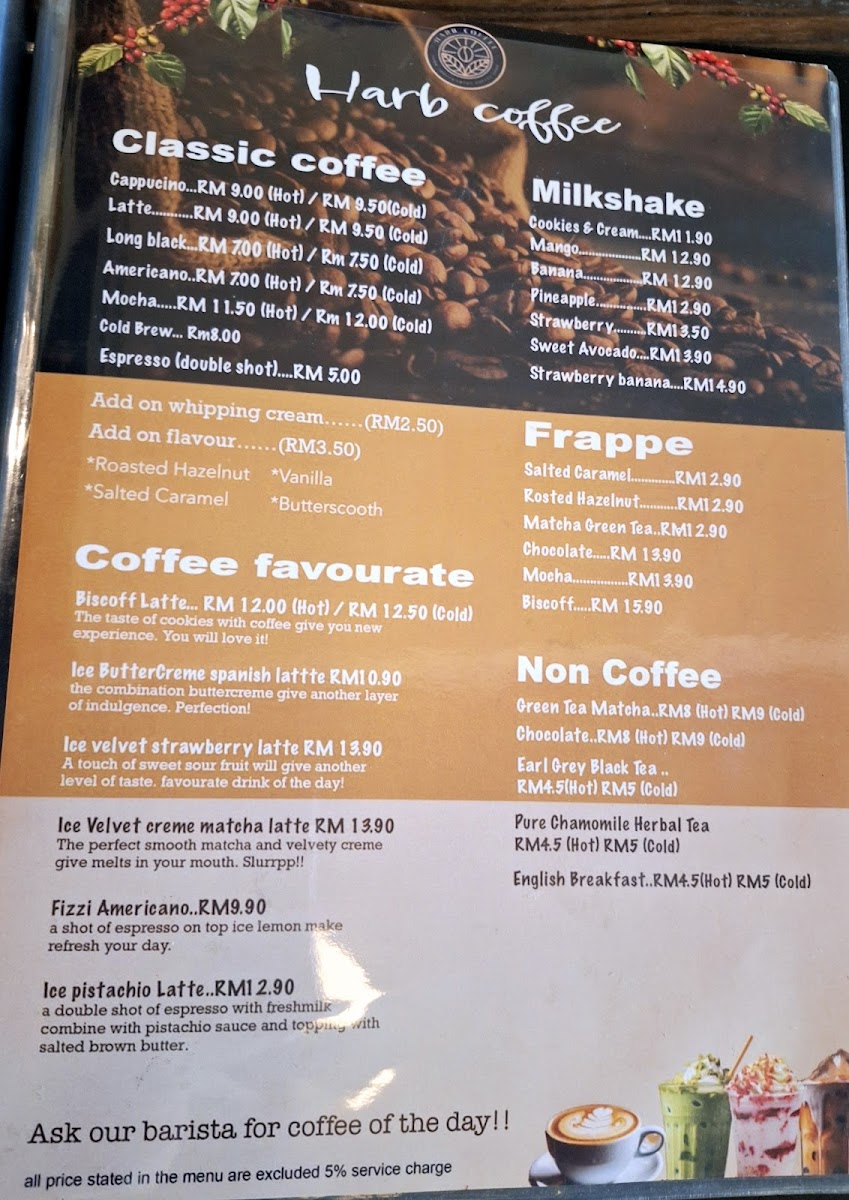 - Drinks: A range of beverages including hot drinks like hot lemon and caffè latte, as well as cold beverages such as chocolate and Oreo milkshakes, strawberry pineapple juice, and specialty local drinks like cendol durian.